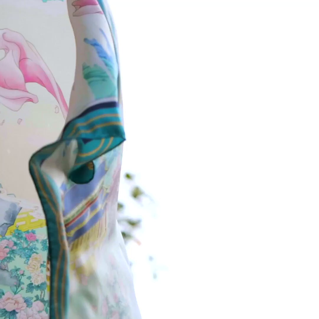 The dancer’s long-flowing silk sleeves trail through the air in ethereal arcs, symbolizing a woman’s inner beauty and feminine mystique. Inspired by Shen Yun’s dance Delicate Beauty of the Han, the scene takes you to a palace’s peony garden during a golden age in Chinese history, the Han Dynasty. Delicate hues of pink and peach meet with turquoise in a joyous design fit for any season.