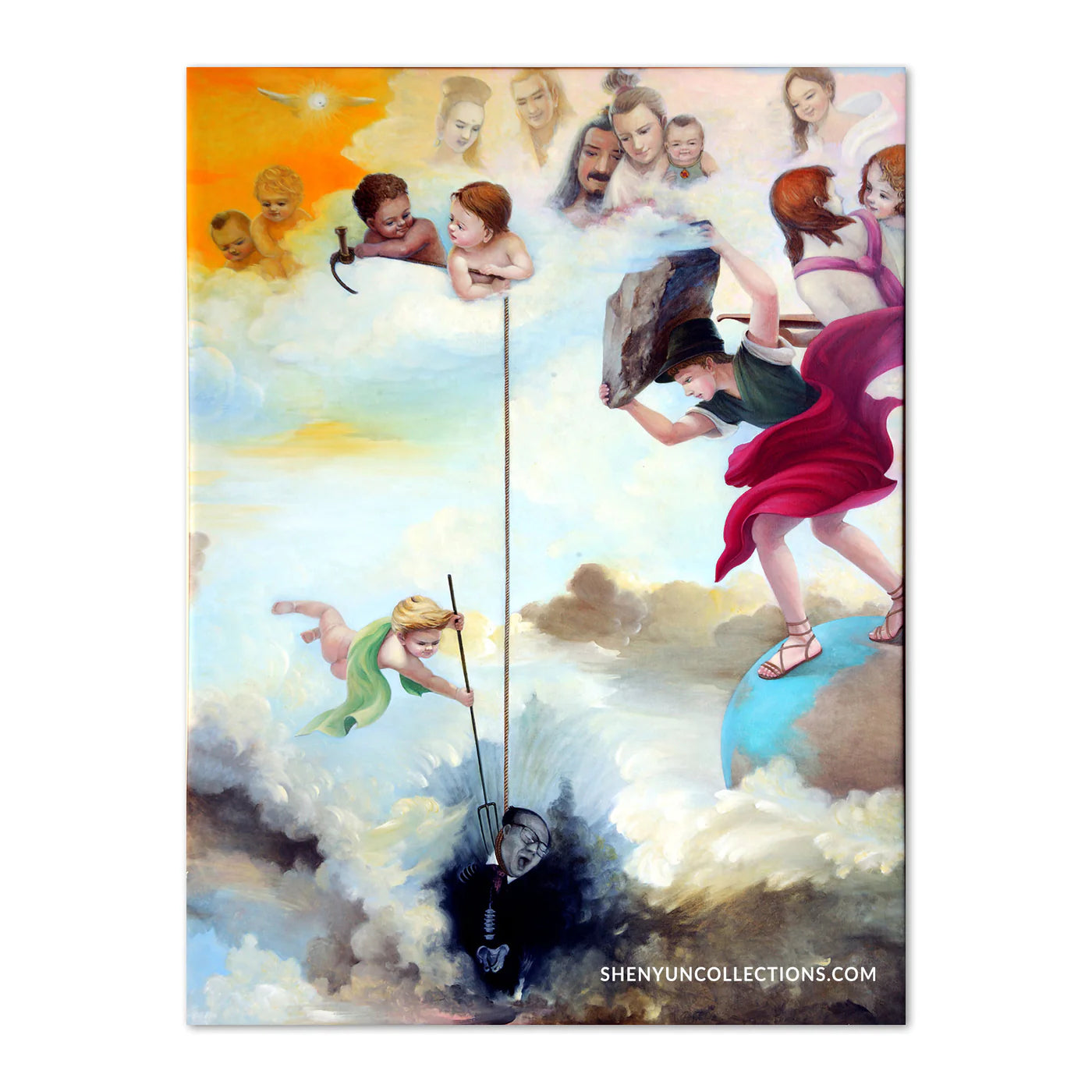 Heavenly beings look on as the representative of evil is extinguished. This work reflects an understanding that evil actions will result in retribution in higher realms.