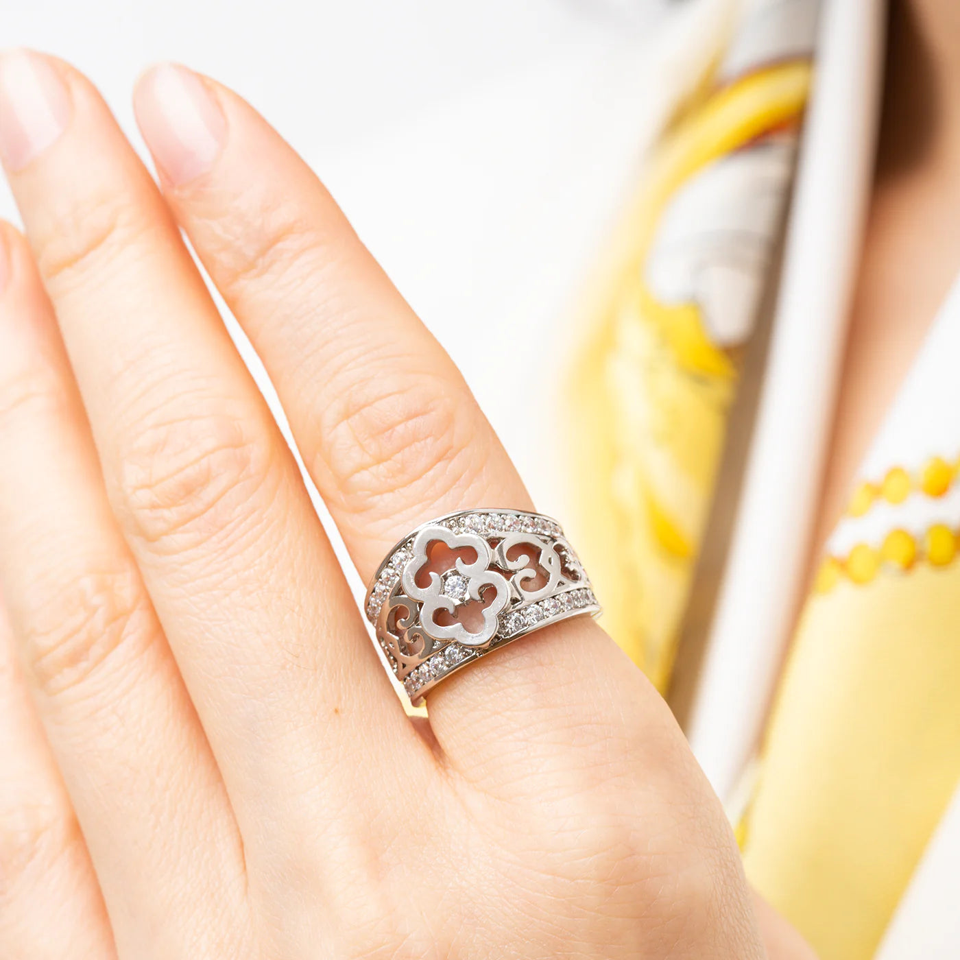Created as a miniature of the Mongolian hat, this specially shaped ring features the recurring ruyi motif from Shen Yun’s Mongolian costumes. Gentle and continuous, it symbolizes a wish for good luck and well-being.