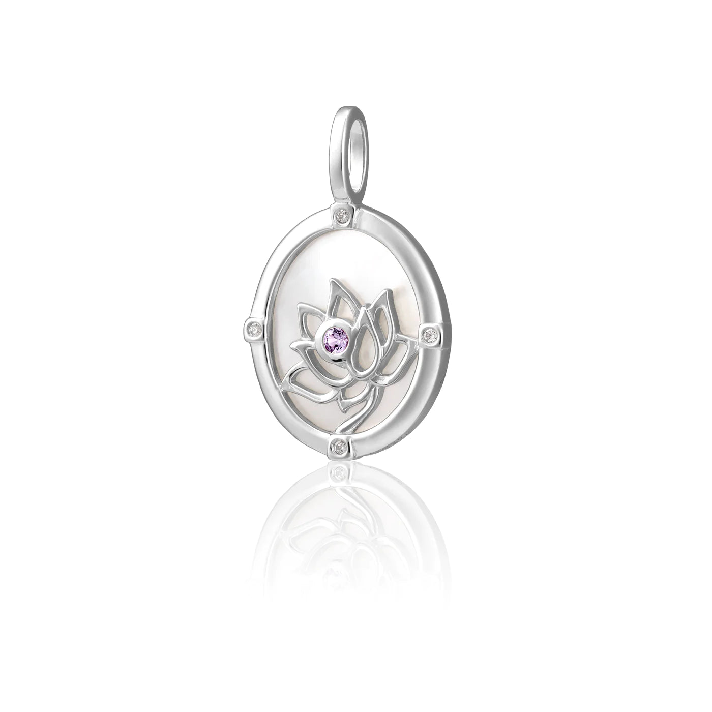Blooming in murky, still waters should be impossible. But the lotus manages to flourish despite the odds, becoming a revered symbol of purity and grace. Featured here in iridescent mother-of-pearl, which is said to bring the wearer peace of mind and inner strength.
