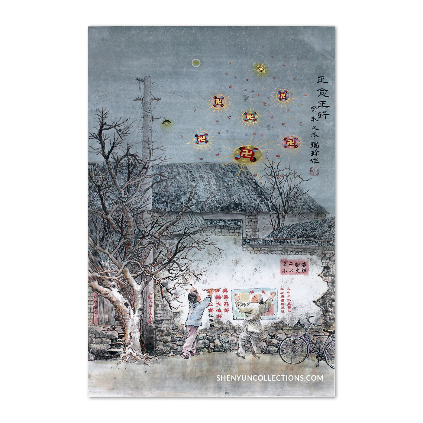 This traditional Chinese painting depicts a scene on a moonlit night in a small village, where a grandmother and her grandchild post messages to their neighbors that tell the truth about the persecution against Falun Gong. The disc-like objects in the sky are Falun, the symbol of Falun Gong.