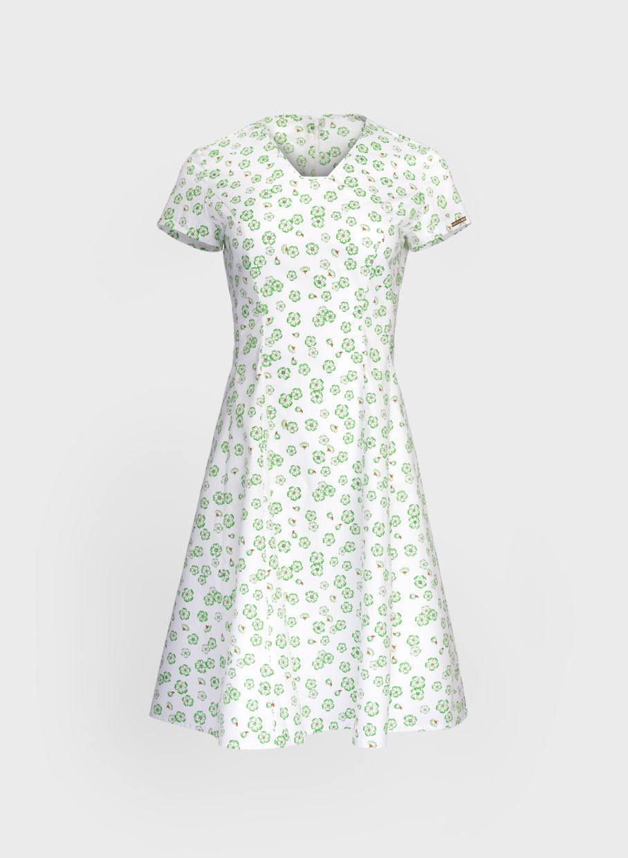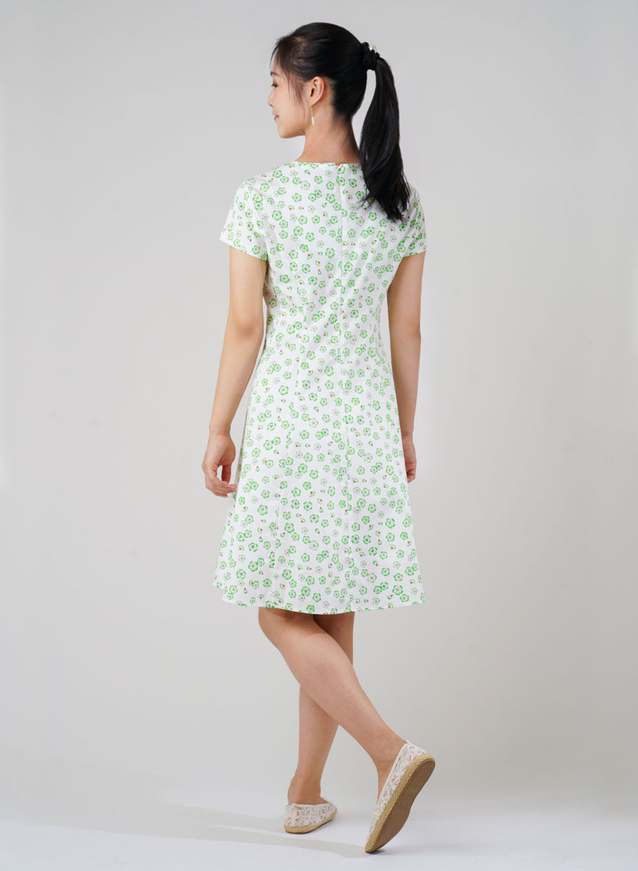 From its eloquent neckline to the unique inseam stitching detail, the dress is patterned with blooming floral prints in four different colors, splendidly suiting the season.