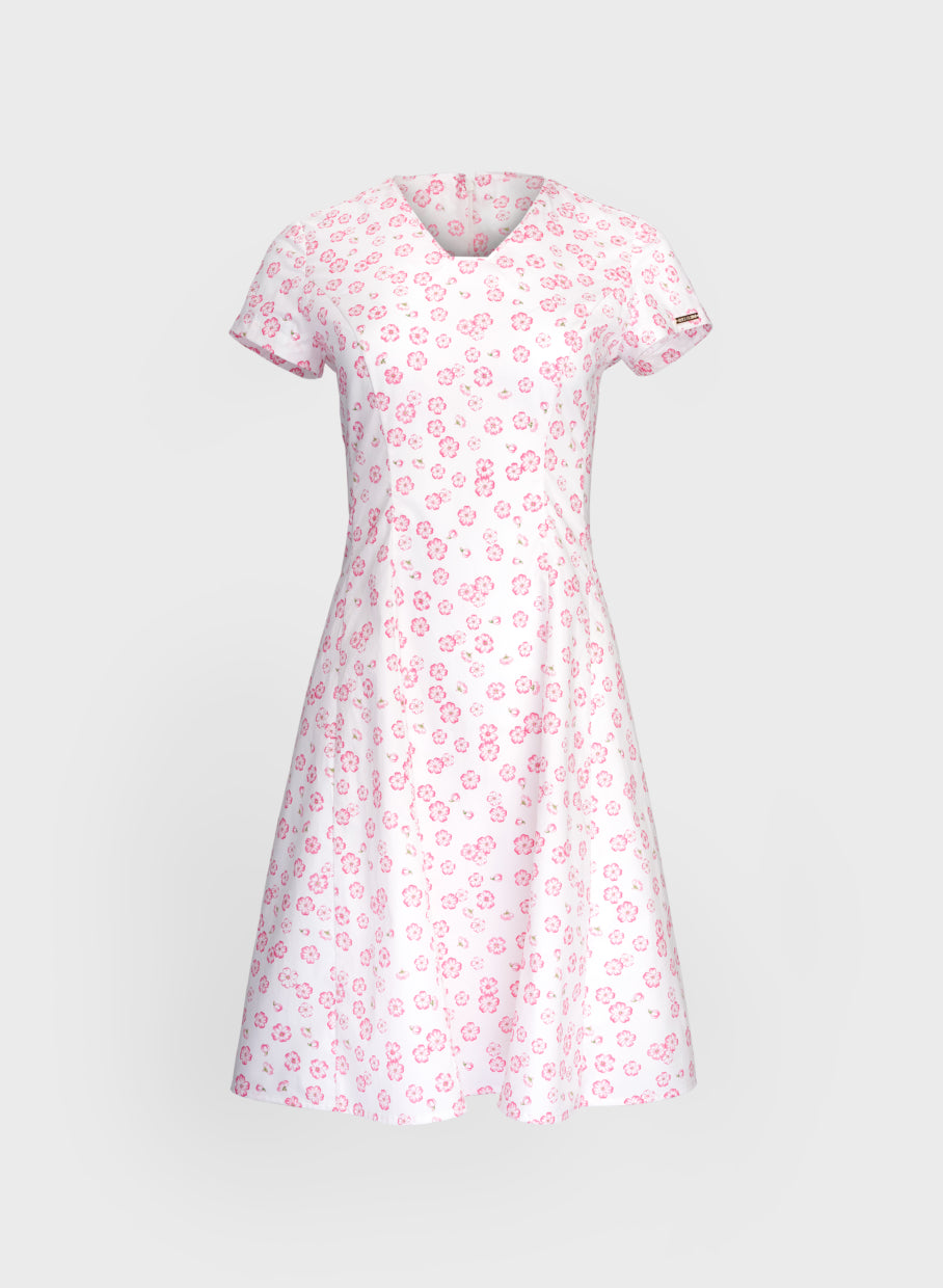 From its eloquent neckline to the unique inseam stitching detail, the dress is patterned with blooming floral prints in four different colors, splendidly suiting the season.
