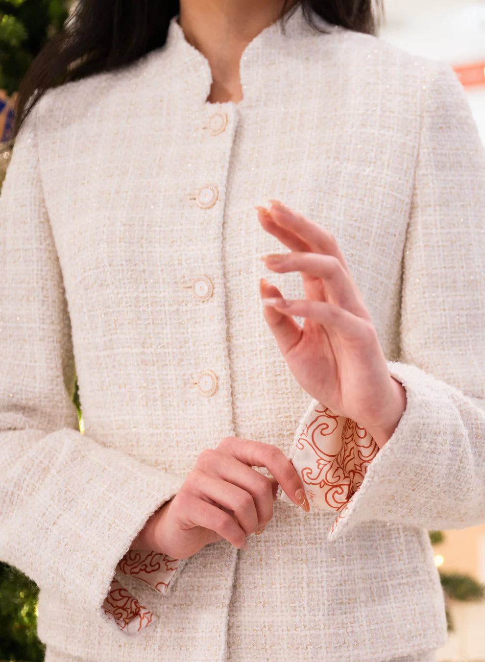 Step into timeless elegance with our white tweed jacket, a versatile essential that transforms any outfit into a masterpiece. Whether you're heading to the office, a brunch date, or a night out, this jacket offers the perfect blend of sophistication and comfort.