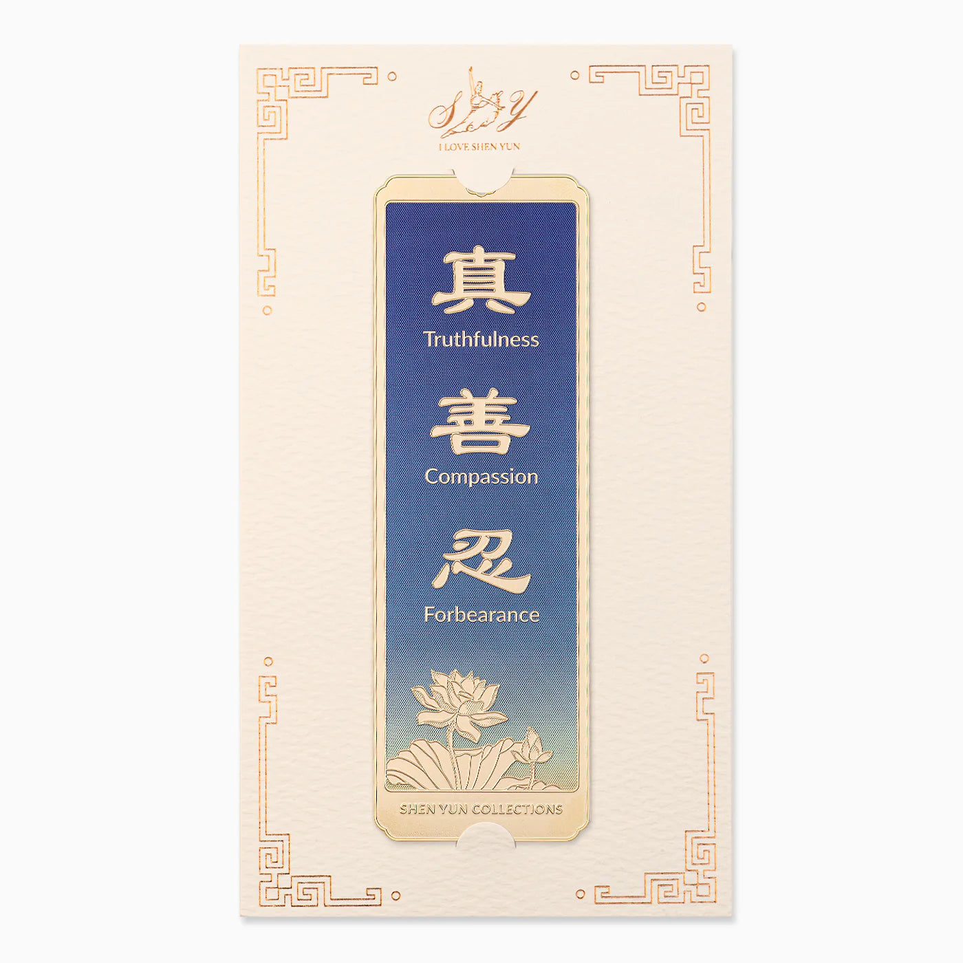 Featuring three elegant characters in an exquisite design, this charming bookmark honors the remarkable values of Falun Dafa, 真 (zhēn) Truthfulness, 善(shàn) Compassion, and 忍 (rĕn) Forbearance, as conveyed in Shen Yun’s dance pieces. May your daily adventures shine with a wonderfulness that reaches toward Heaven.